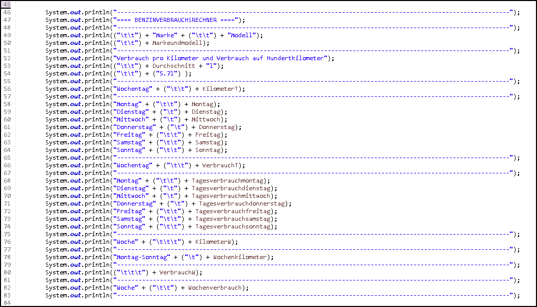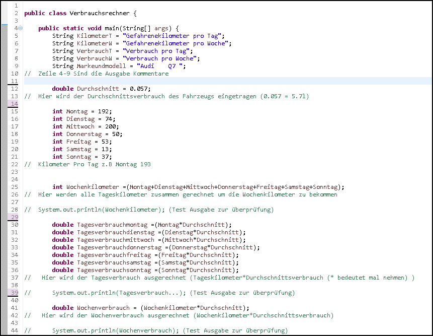 Zeile 90: Hier wird mit dem Dateityp double die Herstellerangabe des Verbrauchs angegeben z.B. 7.4l auf 100 Kilometer.