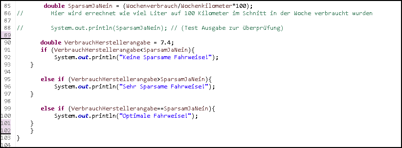 Zeile 91: Hier wird eine if Bedingung erstellt, die sagt Herstellerangabe kleiner als SparsamJaNein.