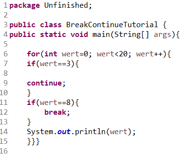 Zeile 7&9 : Eine If-Bedingung wird erstell die besagt, wenn der Integer wert den Wert 3 erreicht (von 0 wird gezählt also 0,1,2,....), soll die Schleife diesen Wert nicht ausgeben und danach weiterlaufen, dank der continue Anweisung.