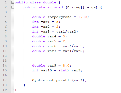 Zeile 15: Diese Zeile zeigt wie aus der Double-Variable var9 durch Typecasting ein Integer erzeugt wird. Der in den Klammern stehende Datentyp gibt an, in welchem Datentyp die darauf folgende Variable umgewandelt wird.