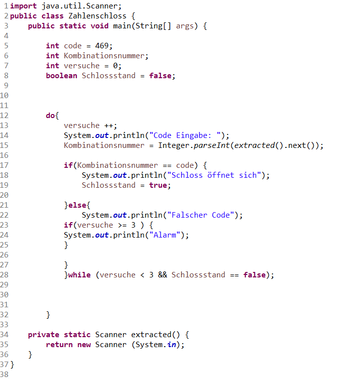 Zeile 5-8 : Hier werden 3 Integer erstellt (code = 469, kombinationsnummer und versuche = 0) und ein boolean = Schlossstand der false gesetzt ist.