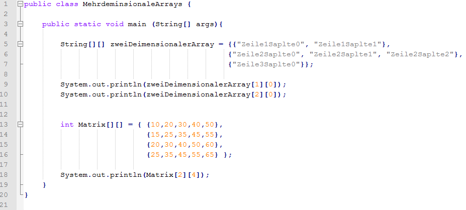 Zeile 13-16: Hier wird ein mehrdimensionales Integer Array initialisiert. Mit 4 Zeilen und 5 Spalten.