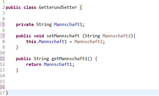 Zeile 7&8 : Hier wird eine Setter-Methode erstellt, die die Variable Mannschaft1 in Mannschaft2 verändert.